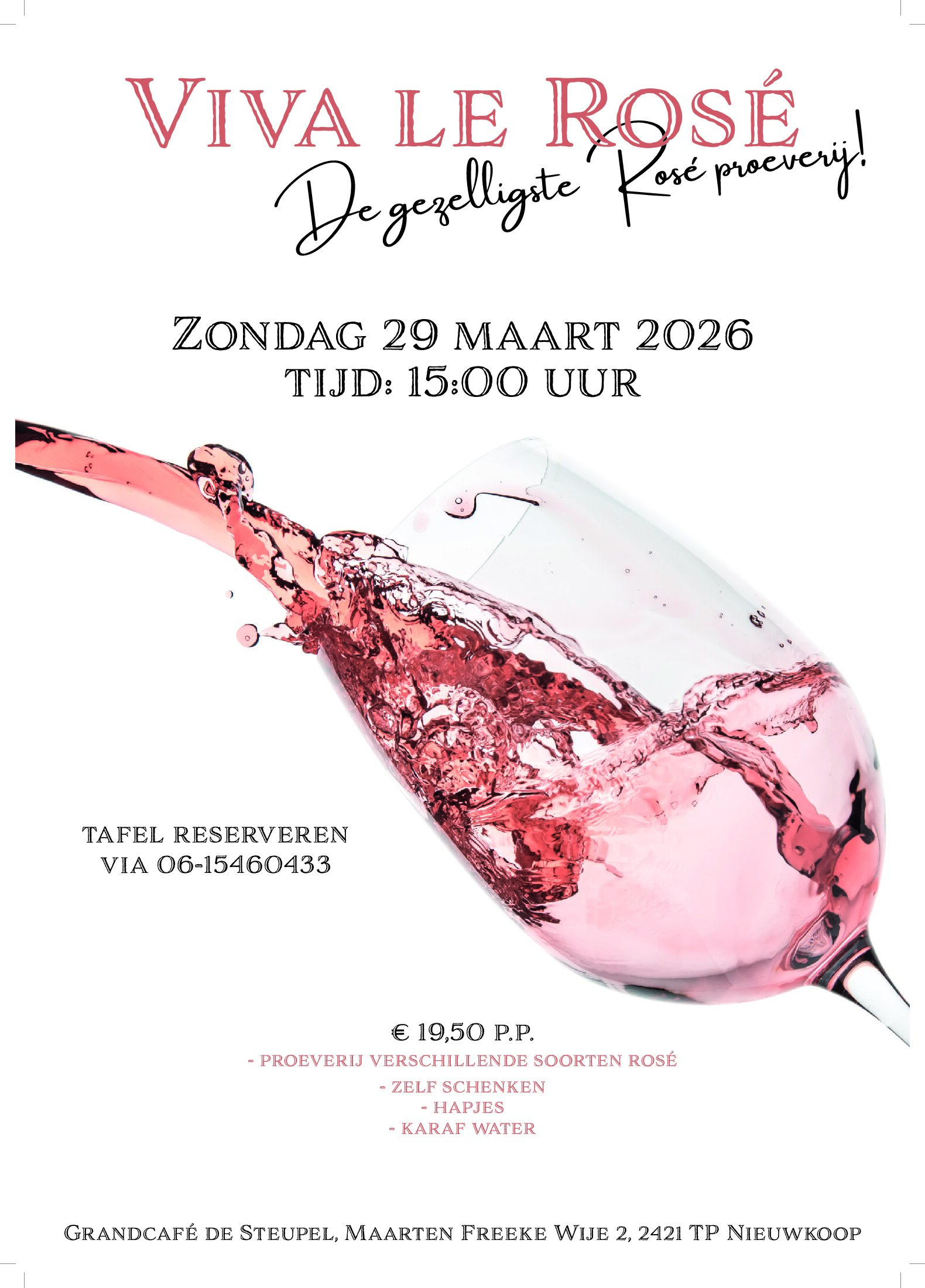 Rosé tijd! Welke rosé is het lekkerste in de heerlijke lente zon!Wie kijkt er niet naar uit de lente ! Alles gaat weer bloeien en iedereen krijgt weer een vrolijk gevoel. Zeker als je op een terrasje kan zitten met een heerlijk glas rosé. Wij willen jullie graag een proeverij laten beleven waar je de heerlijkste en nieuwste rosé wijnen van dit seizoen kan proeven.Rosé is namelijk een heerlijke wijn en…nee het is geen mix van rood en witte wijn. Rosé is wijn die wordt gemaakt van blauwe druiven, soms in combinatie met witte druiven. De wijn krijgt zijn kleur doordat de schillen van de blauwe druiven minder lang bij het sap blijven dan bij de bereiding van rode wijn.